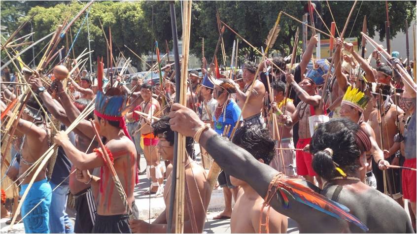 Os discursos das lideranças indígenas, suas faixas de protesto e documentos protocolados durante o Acampamento Terra Livre (ATL 2015) mostravam os conflitos estruturalmente conectados à hostilidade dos Três Poderes, escondidos atrás de siglas misteriosas como PEC 215 (referente ao Poder Legislativo), Portaria 303 (referente ao Poder Executivo), anulação de “Portaria Declaratória” e “Marco Temporal” (ambos de iniciativa do Poder Judiciário).