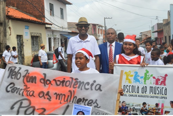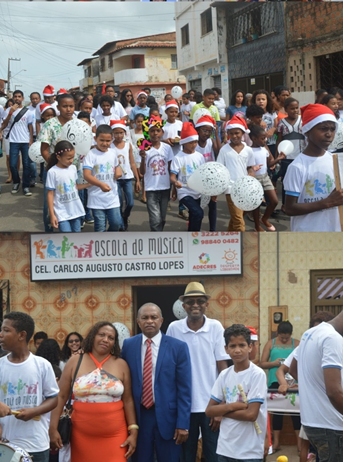 A comunidade do bairro da Liberdade foi surpreendida e aplaudiu a caminhada de alunos, professores e pais de alunos, que foram às ruas pedir paz e uma celebração alegre, solidária e fraterna neste natal. A banda com os jovens da Escola de Música Coronel Carlos Augusto Castro Lopes, proporcionou uma enorme movimentação no bairro e muitas, foram as pessoas que foram ver a banda passar, com uma motivação bem maior. As crianças e os adolescentes fazendo apelos através de cartazes pela paz e o pedido de um basta na violência contra a mulher sensibilizou a todos. O vereador Cézar Bombeiro e o seu irmão Cleinaldo Bil Lopes, criadores da Escola de Música Coronel Carlos Augusto Castro Lopes, que era irmão deles, e de quem partiu a iniciativa da criação da escola de música do bairro da Liberdade, convidados pelos professores participaram da caminhada e se sentiram bastante sensibilizados. Cézar Bombeiro e Cleinaldo Bil Lopes destacaram que além do civismo e da manifestação de cidadania e solidariedade bem expressadas no evento, se sentiram emocionados pela essência que brota para a construção de consciências criticas dos jovens e nos seus genitores que abraçaram a Escola de Música Coronel Carlos Augusto Castro Lopes.