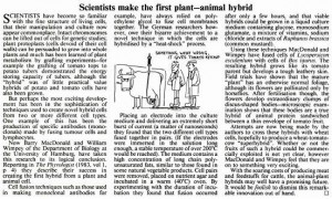 Para chegar ao seu tomate especial, os dois cientistas valeram-se de uma nova técnica de fusão de núcleos de células que utiliza cloques elétricos e calor. Algumas células de tecidos de um tomateiro e de um boi foram imersas em um líquido gorduroso onde, através de um eletrodo, receberam choques elétricos intermitentes que duram apenas 1 bilionésimo de segundo cada um. Esses choques rasgam as membranas externas e dos núcleos celulares – sem, contudo, matar a célula – permitindo que eles se fundam mais tarde, depois de colocados num forno a 40º centígrados. Em seguida, as estruturas celulares resultantes da fusão, os hibridomas, são submergidas em um caldo nutritivo. Finalmente, os hibridomas brotam e se transformam em mudas de tomateiro modificadas e prontas para gerar um fruto que jamais existiu antes.”