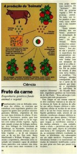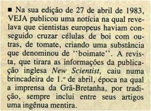 E não é que a revista Veja engoliu a narrativa fantasiosa como verdade fosse? Na edição 764, de 27 de abril de 1983, a revista publicou a matéria “Fruto da carne”, divulgando a “descoberta” de dois biólogos, os quais teriam produzido o “boimate”. “A experiência dos pesquisadores alemães permite sonhar com um tomateiro do qual já se colha algo parecido com um filé ao molho de tomate.”