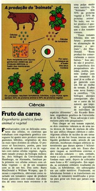 Familiarizados com as delicadas estruturas das células, os cientistas que trabalham com engenharia genética conseguem há quatro anos produzir microorganismos híbridos, originários de dois ou mais tipos distintos de células. O processo só funcionava, porém, para unir células de animais entre si ou de vegetais com outras células vegetais. Agora, num ousado avanço da biologia molecular, dois biólogos da Universidade de Hamburgo, na Alemanha, fundiram pela primeira vez células animais com células vegetais – as de um tomateiro com as de um boi. Deu certo. Barry MacDonald e William Wimpey, que fizeram a experiência, obtiveram como resultado um tomateiro capaz de produzir frutos parecidos com tomates mas dotados de uma casca mais resistente e de uma polpa muito mais nutritiva. Os “boimates” têm 50% de proteína vegetal e 50% de proteína animal. No todo, seu valor protéico é quarenta vezes maior que o dos tomates comuns.