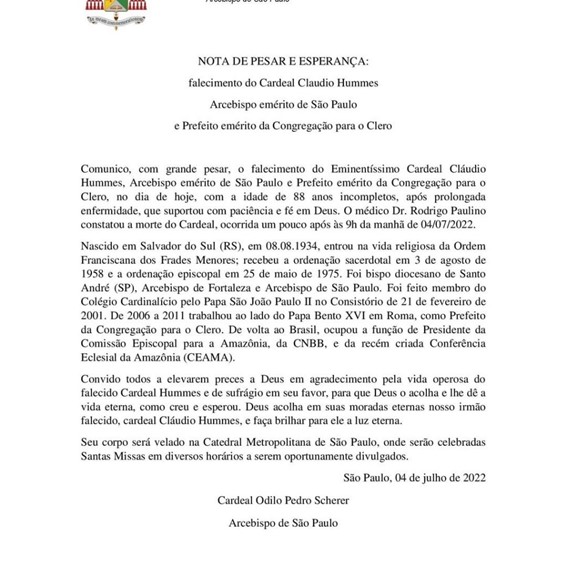 “Comunico, com grande pesar, o falecimento do Eminentíssimo Cardeal Cláudio Hummes, Arcebispo emérito de São Paulo e Prefeito emérito da Congregação para o Clero, no dia de hoje, com a idade de 88 anos incompletos, após prolongada enfermidade, que suportou com paciência e fé em Deus”, escreveu o cardeal.