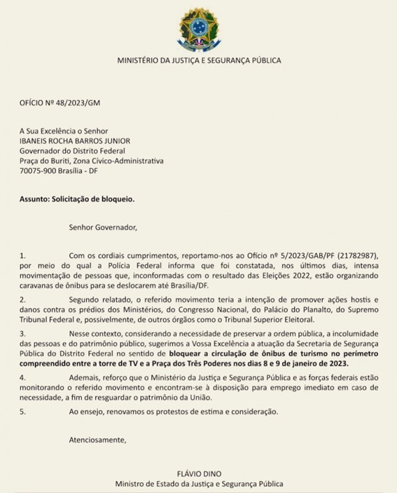 No documento ele fala que poderia acionar a Força Nacional em caso de necessidade.