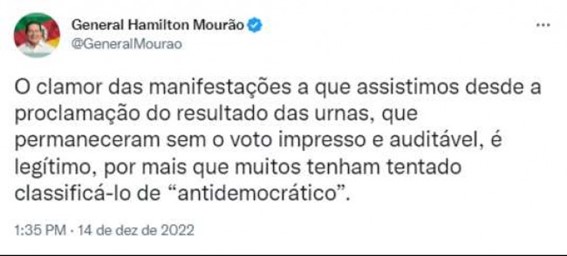Com esta postagem nas redes sociais, o vice-presidente da República, general Hamilton Mourão, defendeu os milhares de manifestantes que seguem nas portas dos quartéis e nas estradas de todo o país.