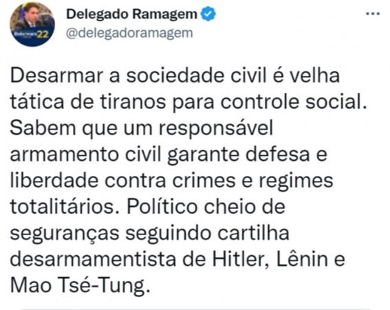 Quem não gostou nada disso foi o deputado federal eleito, Delegado Ramagem, que subiu o tom nas redes sociais e fez um grave alerta: “Desarmar a sociedade civil é velha tática de tiranos para controle social.