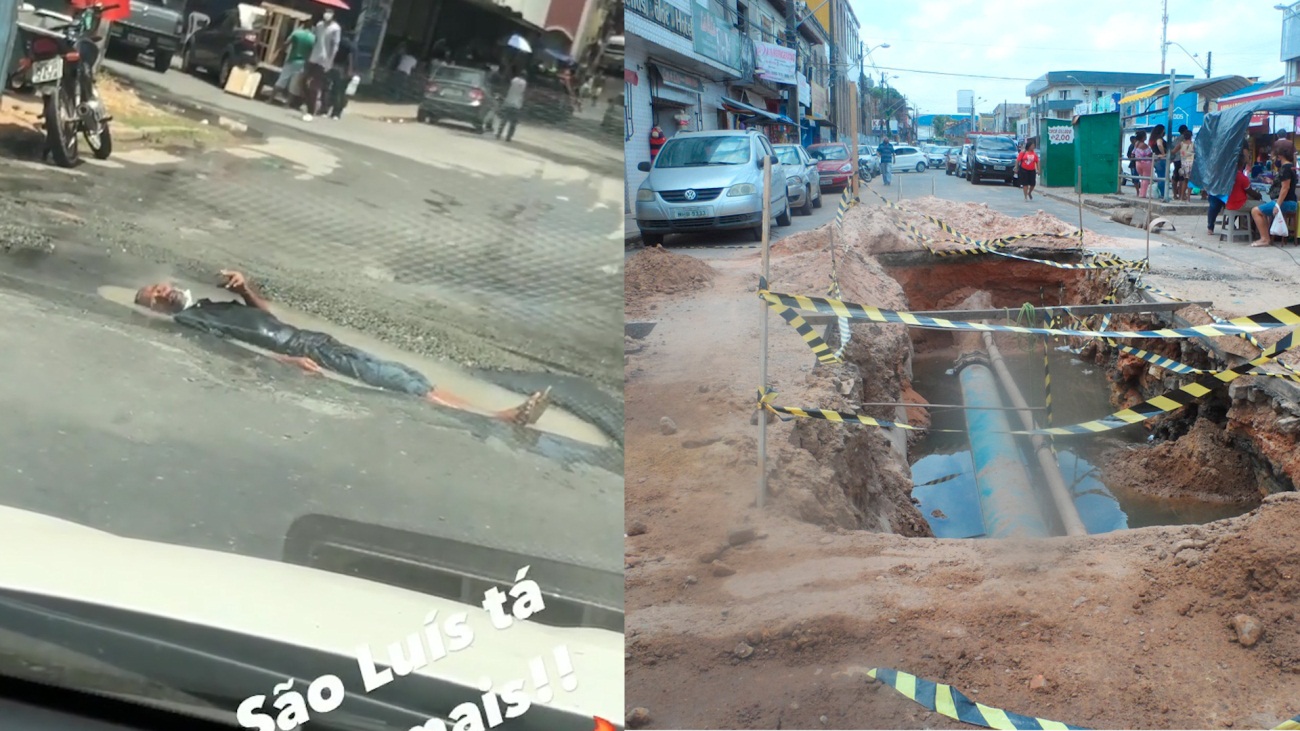 A imagem acima, mostra do lado esquerdo, um morador de rua deitado sobre um pequeno buraco do qual jorrava água potável, que acabou se transformando em um local de banho público para muitas outras pessoas que vivem nas ruas. Como o buraco aumentou e o desperdício se tornou mais acentuado, finalmente a Caema retornou ao local para executar no mesmo lugar mais uma obra pela quarta vez. A bandalheira com o dinheiro público é bem acentuado, que tem causado revolta e indignação das pessoas, pelo que eles qualificam de desvio de recursos públicos pelo Governo do Estado, uma vez que o problema da rua Antonio Raiol é vergonhoso e público. A indiferença dos órgãos de controle e fiscalização é muito séria pela omissão, e se tornram também responsáveis por toda a esculhambação praticada pela Caema.