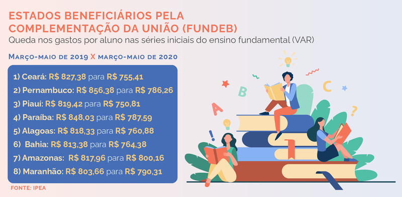 Na comparação entre os meses de março e maio de 2020 com o mesmo período do ano passado, oito estados que tiveram necessidade do complemento da União no Fundeb apresentaram redução no valor investido por aluno matriculado nas séries iniciais do ensino fundamental. Nesse rol, todos os estados são da região Nordeste, com exceção do Amazonas.