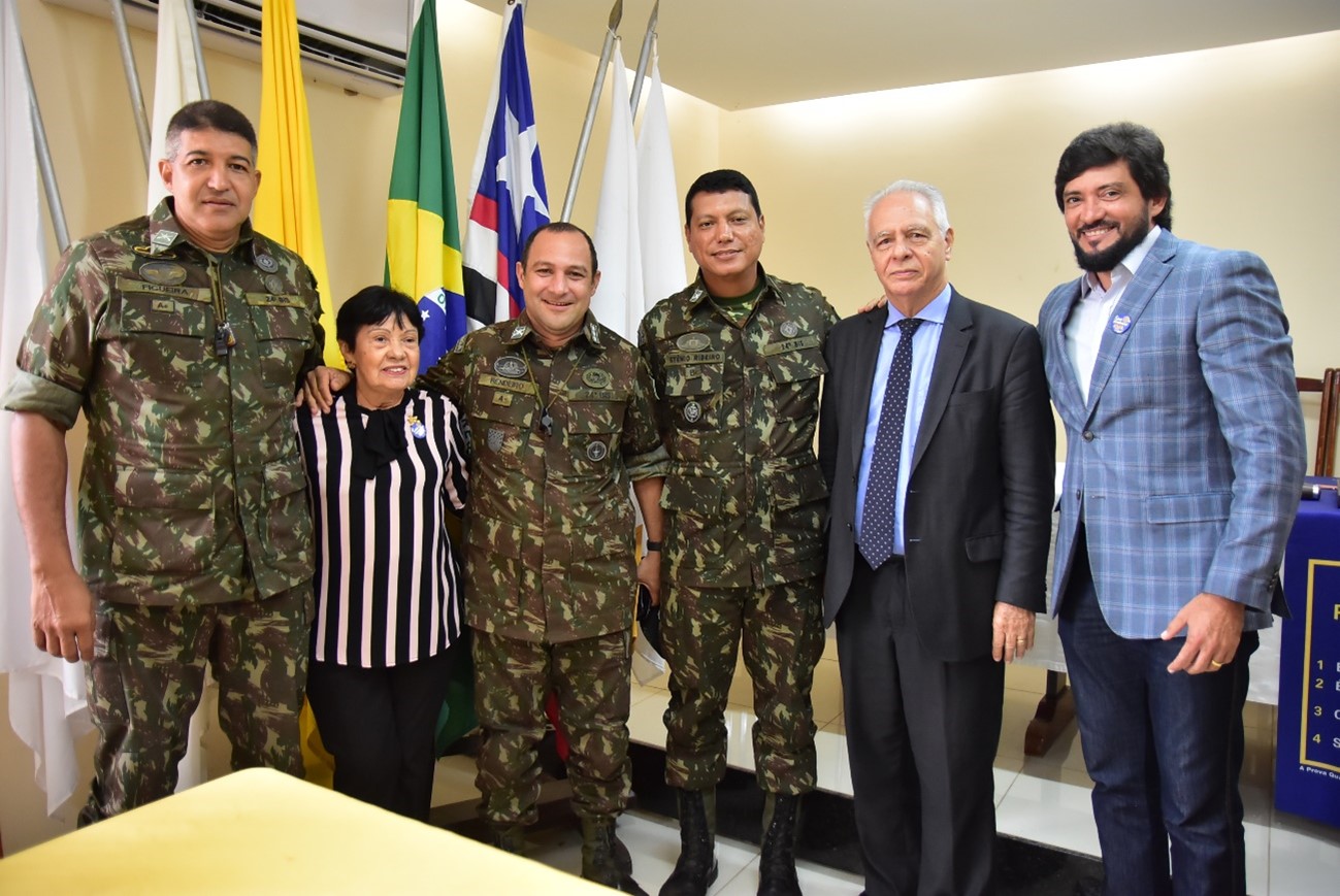 Subtenente Magno Filgueiras, Concita Viana, presidente da Comissão Família Rotária; Coronel Sérgio Rendeiro, Major Stenio Ribeiro, Carlos Nina, presidente do Rotary Praia Grande e Darlon Guimarães, do RC SLZ Praia Grande