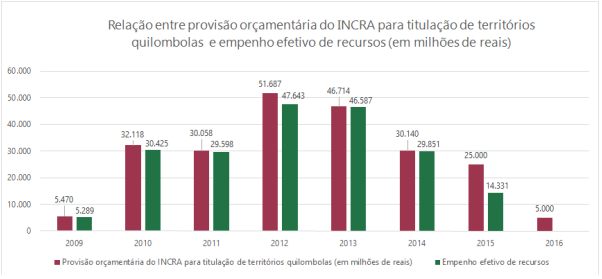 Realizando uma avaliação da eficiência do Instituto Nacional de Colonização e Reforma Agrária (INCRA) quanto ao trabalho realizado, isto tendo em referência o recurso a este órgão destinado para a titulação dos territórios quilombolas de 2009 a 2015, observa-se que, conforme o quadro abaixo, apenas nos anos de 2012 e 2015 a execução orçamentária esteve aquém do quanto disponível para desapropriações, quando foram executados, respectivamente, 92% e 57% da verba disponível.