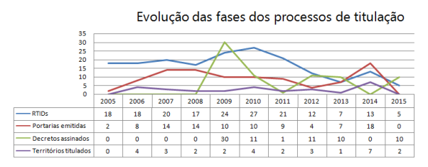 Pelo quadro se observa que houve algum crescimento da política de titulação até o ano de 2009, havendo uma acentuada queda a partir de 2010, com uma pequena recuperação em 2014 e nova desaceleração em 2015. Se o atual ritmo de titulações permanecesse estável, e fossemos levar em conta que as titulações dos territórios quilombolas iniciaram apenas no ano de 2004, logo após à edição do Decreto Federal 4887/03, tendo ainda como referência que hoje oficialmente existem 2.648 comunidades quilombolas reconhecidas pelo Estado, seriam necessários mais de 970 anos para que o Estado brasileiro cumprisse com a determinação constitucional de titular todos os territórios quilombolas. A simples evidência de que o Estado brasileiro poderia levar quase mil anos para titular todos os territórios quilombola no Brasil é gravíssima prova do profundo racismo institucional que persiste em nossa sociedade.