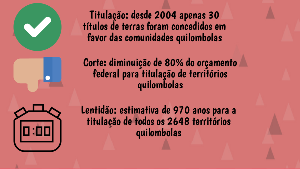 A destinação de verbas federais para a titulação de territórios quilombolas em 2016 sofreu corte de 80%, se comparada com a destinação de 2015. Assim, passados 484 anos do início da escravidão negra no Brasil, outros 128 anos da sua abolição formal e inconclusa e, ainda, outros 28 anos da promulgação da Constituição Federal que finalmente reconheceu às comunidades quilombolas direitos às suas terras tradicionais, para o ano de 2016 estão destinados para titulação de territórios quilombolas apenas 5 milhões de reais, em contraposição aos 25 milhões destinados ano passado. Mais uma vez é a população negra que sofre no momento de arrocho econômico do Estado: o corte orçamentário mais profundo é na carne negra.