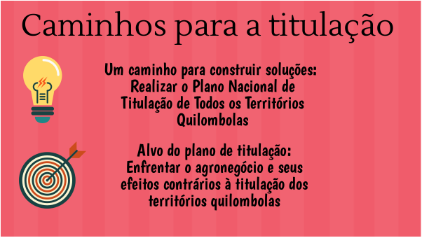 Essa dinâmica de desaceleração da já insuficiente ação do Estado para titular os territórios das comunidades quilombolas impõe o estabelecimento de um Plano Nacional de Titulação dos Territórios Quilombolas. Isto, pois atualmente o Estado não tem metas claras para a titulação de territórios, muito menos um plano estratégico para que se monitore a execução da política. A Constituição Federal de 1988, em seu art. 5º, LXXVIII, reconheceu a duração razoável do processo como direito fundamental. Sabendo que a política pública de titulação dos territórios quilombolas se dá através de processos administrativos, é possível afirmar que o Estado brasileiro viola frontalmente a Constituição também nesse quesito. A adoção de um plano estratégico nacional para as titulações dos territórios com metas, indicadores e prazos de execução é juridicamente impositiva, politicamente necessária e moralmente indispensável.
