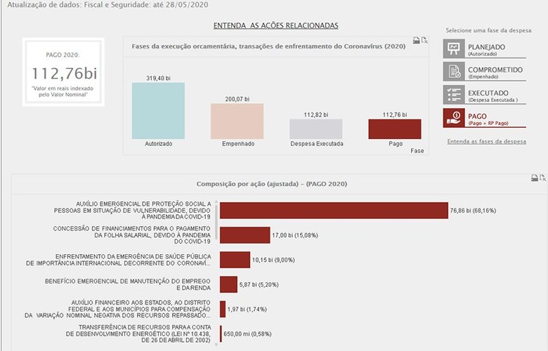 Os dados constam em uma plataforma online de acompanhamento dos gastos federais no combate à pandemia. A ferramenta foi lançada pela Consultoria de Orçamentos, Fiscalização e Controle do Senado Federal. No site é possível consultar para onde está indo o dinheiro dividindo por política, por órgão e por estado.