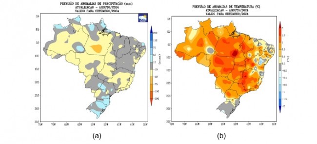 A previsão do Instituto Nacional de Meteorologia (Inmet) para o mês de setembro indica chuvas acima da média na faixa norte da Região Norte, sul do Mato Grosso do Sul e de São Paulo, bem como em grande parte da Região Sul (tons em azul no mapa da Figura 1a).