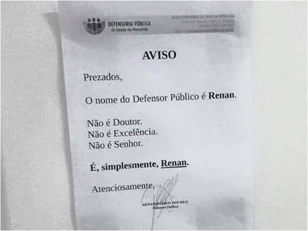 Um aviso colado na porta do seu gabinete por um Defensor Público de Lago da Pedra, a 305 km de São Luís, chamou a atenção nas redes sociais. O comunicado diz: “O nome do Defensor Público é Renan. Não é Doutor. Não é Excelência. Não é Senhor. É, simplesmente, Renan”. A postagem teve mais de 1,4 mil compartilhamentos.