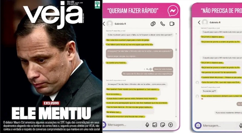 “Antes do início do interrogatório, Cid foi advertido [pelo ministro do STF Alexandre de] Moraes sobre a obrigação de falar apenas a verdade. Ao afirmar, na sequência, que não usou a rede social [em resposta ao advogado de Bolsonaro], ele mentiu”, diz Veja. O advogado de Bolsonaro Celso Vilardi perguntou a Mauro Cid se ele havia usado um perfil de redes sociais para se comunicar com alguém. O tenente-coronel disse que não, mas a revista Veja obteve uma série de conversas que mostram que revelou a terceiros o teor dos depoimentos usando a conta de sua esposa no Instagram.