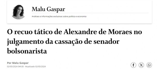 Para a jornalista Malu Gaspar, de O Globo, o ministro Alexandre de Moraes não está preocupado em fazer Justiça. É o que ela deixa claro em seu artigo publicado sob o título: O recuo tático de Alexandre de Moraes no julgamento da cassação de senador bolsonarista. Para Malu, Moraes está jogando um jogo, cujo objetivo é combater o ‘bolsonarismo’. Segundo ela, no caso do senador Jorge Seif, o ministro fez um ‘recuo tático’. Malu diz isso na maior tranquilidade e a sua opinião é repercutida por diversos veículos de comunicação.