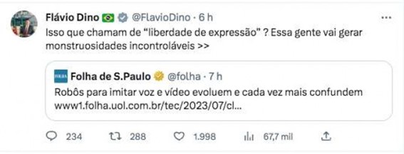O ministro da Justiça do governo Lula, o comunista Flávio Dino, voltou a mostrar as garras na manhã deste sábado (1), após se deparar com uma notícia sobre tecnologia publicada pela Folha de S.Paulo, no Twitter, com o seguinte título: