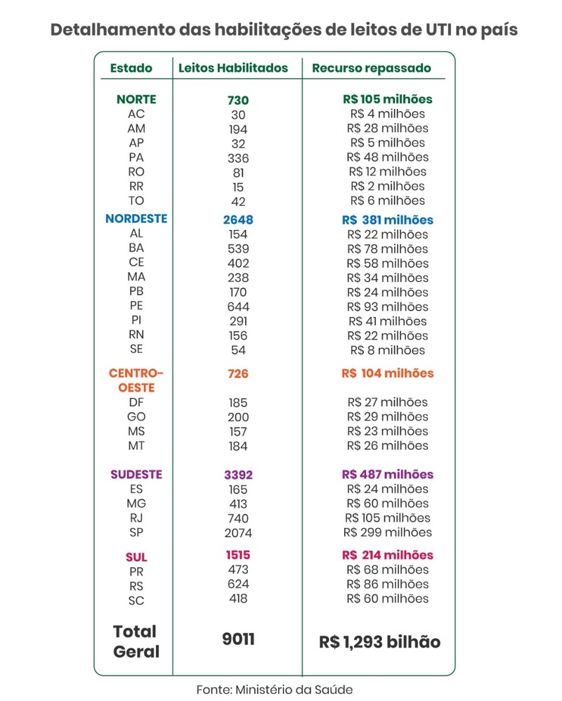 O Sul do país concentra 1.515 leitos de UTI habilitados pelo Ministério da Saúde, enquanto no Norte brasileiro, são 730. Por fim, o Centro-Oeste aparece como a região que menos recebeu leitos até o momento – são 726, segundo o Governo Federal.