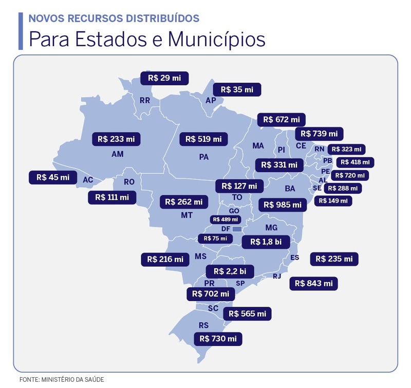 “Nós precisamos frear essa transmissão. Esse recurso se destina exatamente para as ações de enfrentamento do coronavírus na atenção básica e na média e alta complexidade. A gente espera que agora os municípios consigam dar uma resposta melhor para, principalmente, a quebra da transmissão e consiga entrar em curva de declínio no número de casos”, avalia. Os recursos podem ser usados para compra de equipamentos de proteção individual (EPIs), medicamentos, contratação de profissionais de saúde, habilitação de leitos de UTI, incremento ao teto hospitalar e habilitação de Centros Comunitários de referência. Segundo o Ministério da Saúde, o foco do repasse é melhorar a assistência ao cidadão. Do repasse total autorizado, R$ 11,3 bilhões são para municípios e R$ 2,5 bilhões para estados.