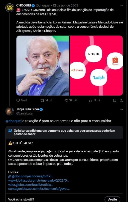 Há um episódio enfático, porém pouco recordado após os episódios mais recentes envolvendo a página. É que em abril deste ano, um post da Choquei tentou dar uma repercussão ‘positiva’ para a taxação de compras estrangeiras pela internet, acima de R$50 – medida anunciada pelo governo federal. Como em um ato orquestrado, a primeira dama Rosangela da Silva, a Janja, respondeu o post dizendo que a cobrança seria apenas para as empresas e não ao consumidor final, sendo checada pelos usuários da rede social X.