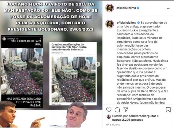 “Se aproveitando de uma foto antiga, o apresentador Luciano Huck e ex-aspirante a candidato à presidência da República, ilude seus milhares de seguidores como se a foto da aglomeração fosse das manifestações de ontem, convocadas pelos partidos de esquerda, contra o presidente Bolsonaro. Não satisfeito, Huck ainda fez diversas postagens no stories fazendo alusão ao governo como um “pesadelo” que iria passar e sugerindo que o presidente da república é pior que o vírus. Mas de onde menos se espera é de onde não sai nada mesmo. O que esperar de uma pupila da Rede Globo que faz “caridade” com dinheiro de patrocínio? Amigo íntimo e apoiador de Aécio Neves, (quem não lembra da foto da apuração dos votos em 2014?) Esse mesmo Huck “indignado” comprou um Jatinho de R$ 18 milhões financiado pelo BNDES. Huck, com seu claro desvio de informação e inúmeras atitudes questionais é um desserviço ao povo brasileiro. O governo Bolsonaro acabou com a mamata da Rede Globo, que em governos anteriores era uma torneira de desperdício de dinheiro público e falcatruas. Deve ser por isso sua pseudo indignação, ou será por que não decolou nas pesquisas para presidente?”, detonou Luiz Lima, escancarando ainda as muitas vergonhas e hipocrisias do apresentador.