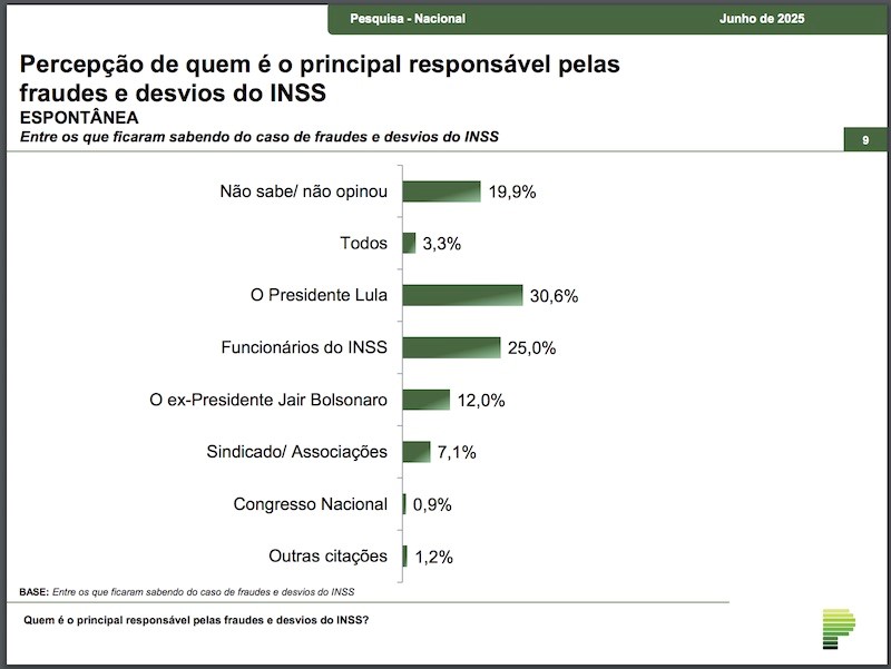 A maior parte dos entrevistados de levantamento nacional do Paraná Pesquisas considera Lula (PT) o maior responsável pelo roubo bilionário aos aposentados do INSS, por meio de descontos não autorizados para sindicatos e associações picaretas. O Paraná Pesquisa quis saber entre os 90,5% brasileiros que tomaram conhecimento do roubo a percepção de quem é o principal responsável. A maior parte dos entrevistados – 30,6% – apontaram espontaneamente o petista Lula, seguido de “Funcionários do INSS”, com 25%, o ex-presidente Jair Bolsonaro (PL) 12%, sindicatos e associações 7,1% e Congresso Nacional com 0,9%