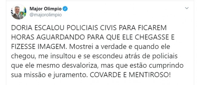 Em sua redes sociais, Major Olímpio desabafou e reafirmou que Doria é um covarde e mentiroso.