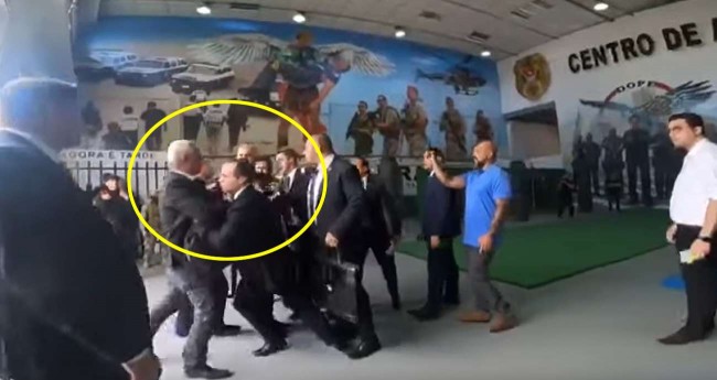 O senador foi contido por vários policiais e seguranças e posteriormente teve que sair do local.