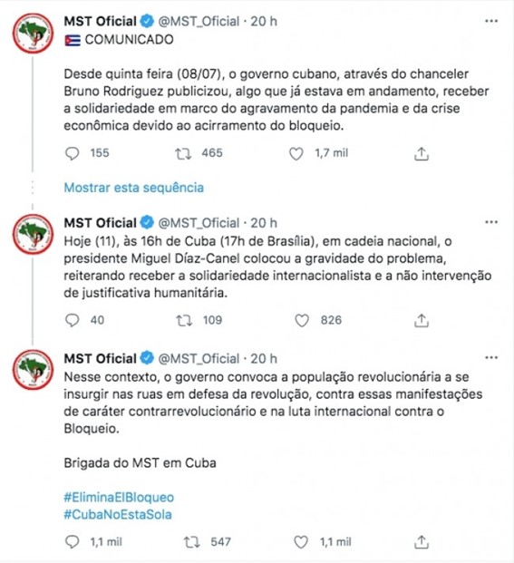 “Nesse contexto, o governo convoca a população revolucionária a se insurgir nas ruas em defesa da revolução, contra essas manifestações de caráter contrarrevolucionário e na luta internacional contra o Bloqueio. Brigada do MST em Cuba”, diz o texto publicado no perfil do movimento.