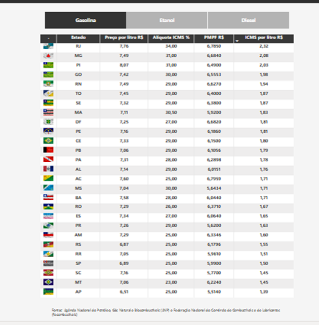 Os governadores argumentam que não aumentaram as alíquotas de ICMS nos últimos anos. Embora seja um percentual fixo sobre o PMPF (saiba mais abaixo), o ICMS que os estados arrecadam sobre os combustíveis aumenta à medida que esses produtos ficam mais caros. Ou seja, quanto mais cara a gasolina, mais o consumidor paga de imposto estadual e mais os governos arrecadam.