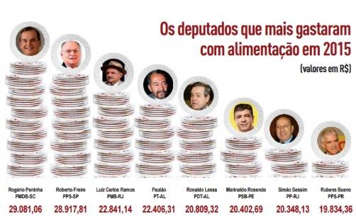 Apenas oito deputados ficaram com 10% do R$ 1,8 milhão que a Casa gastou com o ressarcimento de refeições dos parlamentares em 2015, mostra a Revista Congresso em Foco
