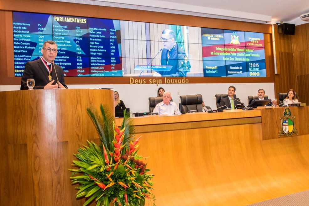 Em sessão solene realizada na manhã desta quarta-feira (10), a Assembleia Legislativa homenageou o padre Claudio Sousa Fernandes, a quem foi entregue a Medalha do Mérito Legislativo “Manuel Beckman”. A condecoração foi proposta pelo deputado Eduardo Braide (PMN).