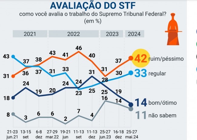 A sequência de duras decisões monocráticas e o ativismo do STF não tem agradado a população e a avaliação positiva da Corte, que já não era boa, simplesmente despencou. A intromissão da corte em temas sensíveis e que não lhe dizem respeito, como aborto e porte de drogas, parece ter sido fundamental para a enorme rejeição.
