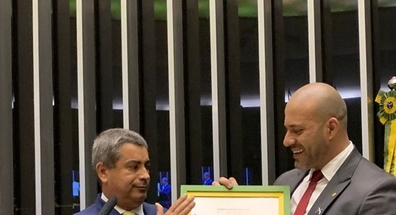 Em um só dia, deputado condenado e depois indultado é escolhido para cargos-chave na Câmara e virou estrela em ato no Planalto, com a presença de Bolsonaro. Deputado Daniel Silveira: estrela de evento e alvo de homenagens, recebe decreto de indulto emoldurado das mãos do deputado Coronel Augusto.