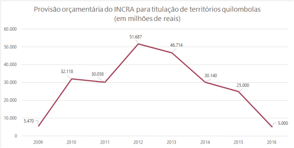 A destinação de verbas federais para a titulação de territórios quilombolas em 2016 sofreu corte de 80%, se comparada com a destinação de 2015. Assim, passados 484 anos do início da escravidão negra no Brasil, outros 128 anos da sua abolição formal e inconclusa e, ainda, outros 28 anos da promulgação da Constituição Federal que finalmente reconheceu às comunidades quilombolas direitos às suas terras tradicionais, para o ano de 2016 estão destinados para titulação de territórios quilombolas apenas 5 milhões de reais, em contraposição aos 25 milhões destinados ano passado. Mais uma vez é a população negra que sofre no momento de arrocho econômico do Estado: o corte orçamentário mais profundo é na carne negra.
