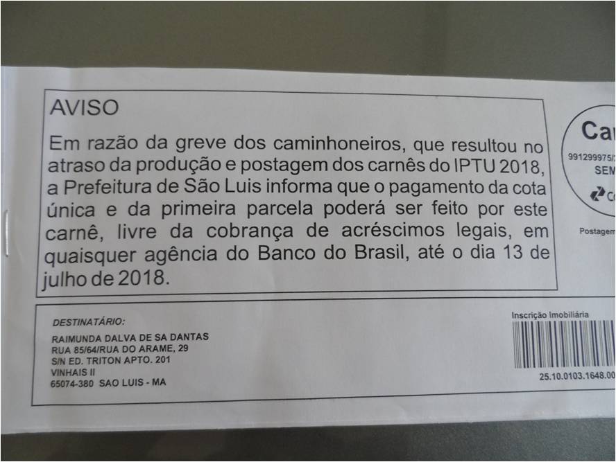 A Prefeitura de São Luís anexou aos carnês do IPTU 2018, um comunicado com justificativa para atraso na entrega. Ela responsabiliza a greve dos caminhoneiros pelo atraso da produção e postagem, mas não deixou claro o que realmente aconteceu.