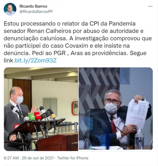 “Estou processando o relator da CPI da Pandemia senador Renan Calheiros por abuso de autoridade e denunciação caluniosa. A investigação comprovou que não participei do caso Covaxim e ele insiste na denúncia. Pedi ao PGR, Aras as providências.”
