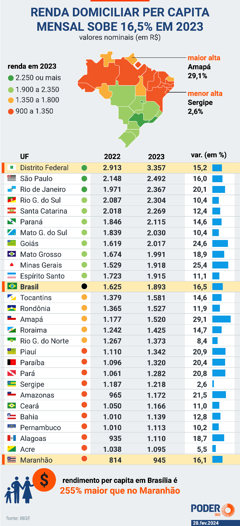O rendimento domiciliar per capita (por pessoa) do Maranhão é 28,15% do registrado no Distrito Federal. A renda per capita para o Brasil foi de R$ 1.893, e varia de R$ 945 no Maranhão a R$ 3.357 no Distrito Federal. A informação divulgada no início do mês de março por meio de um estudo e pesquisa pelo IBGE (Instituto Brasileiro de Geografia e Estatística), calculado com base na Pnad (Pesquisa Nacional por Amostra de Domicílios), mas toma proporções sérias, diante das tentativas de governos estaduais tentarem escamotear a realidade, como o do Maranhão, que é a pior de todos Estados da Federação