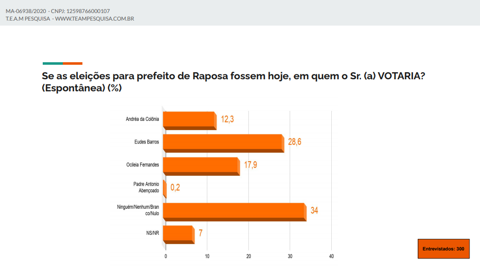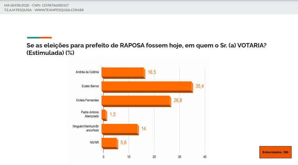 A avaliação do cenário municipal da Raposa foi realizada no período de 02 a 4 de outubro de 2020, com 300 entrevistas. A margem de erro é de 5 pontos para cima ou para baixo e o nível de confiança de 95%.A pesquisa tem registro na Justiça Eleitoral com o número MA-06938/2020.
