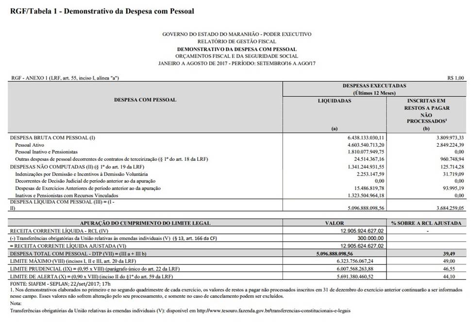 Ainda de acordo com o relatório, a Despesa Total com Pessoal é de 39,49% sobre a RCL, estando abaixo tanto do limite máximo (49,00%), quanto do prudencial (46,55%) e de alerta (44,10%). O Maranhão não possui restrição fiscal para aumento de despesa com pessoal.
