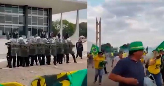 A manifestação contra os abusos dos ministros do STF corria sem incidentes, até que policiais covardemente começaram a lançar bombas de gás lacrimogêneo e atirar com balas de borracha contra a população. O fato ocorreu após alguns manifestantes atirarem tomates e ratos em direção à suprema corte.