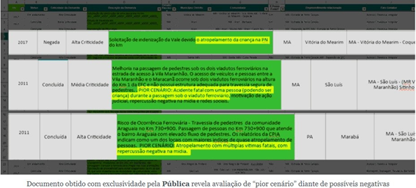 Já em outro caso, moradores da Vila Maranhão, em São Luís, solicitaram melhoria na passagem de pedestres sob os dois viadutos ferroviários na estrada de acesso à comunidade. A companhia classificou o pedido como “de média criticidade” e avaliou qual seria o “pior cenário” se não tomasse providências: “acidente fatal com uma pessoa (podendo ser criança) durante a passagem sob o viaduto ferroviário, motivação de ação judicial, repercussão negativa na mídia e redes sociais”.